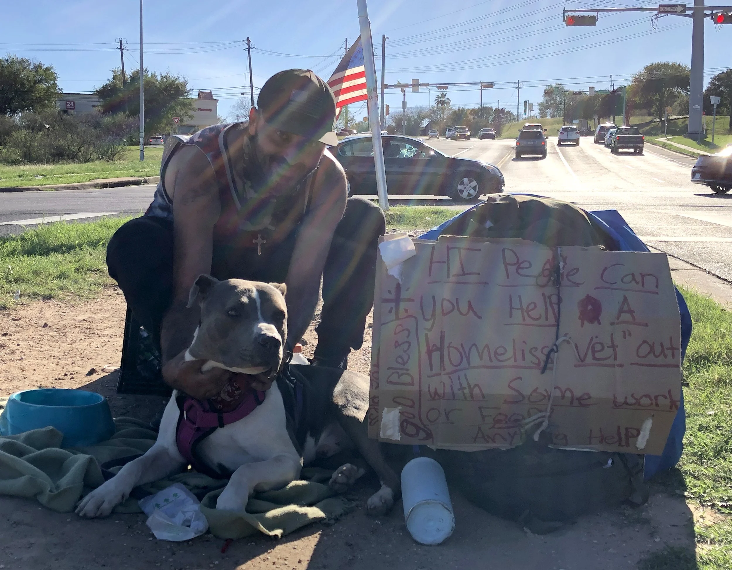 Former U.S. marine, William Davis poses with his dog, Buddy, at a busy intersection on East Riverside Dr. Saturday, Oct. 16, 2021, in Austin Texas.