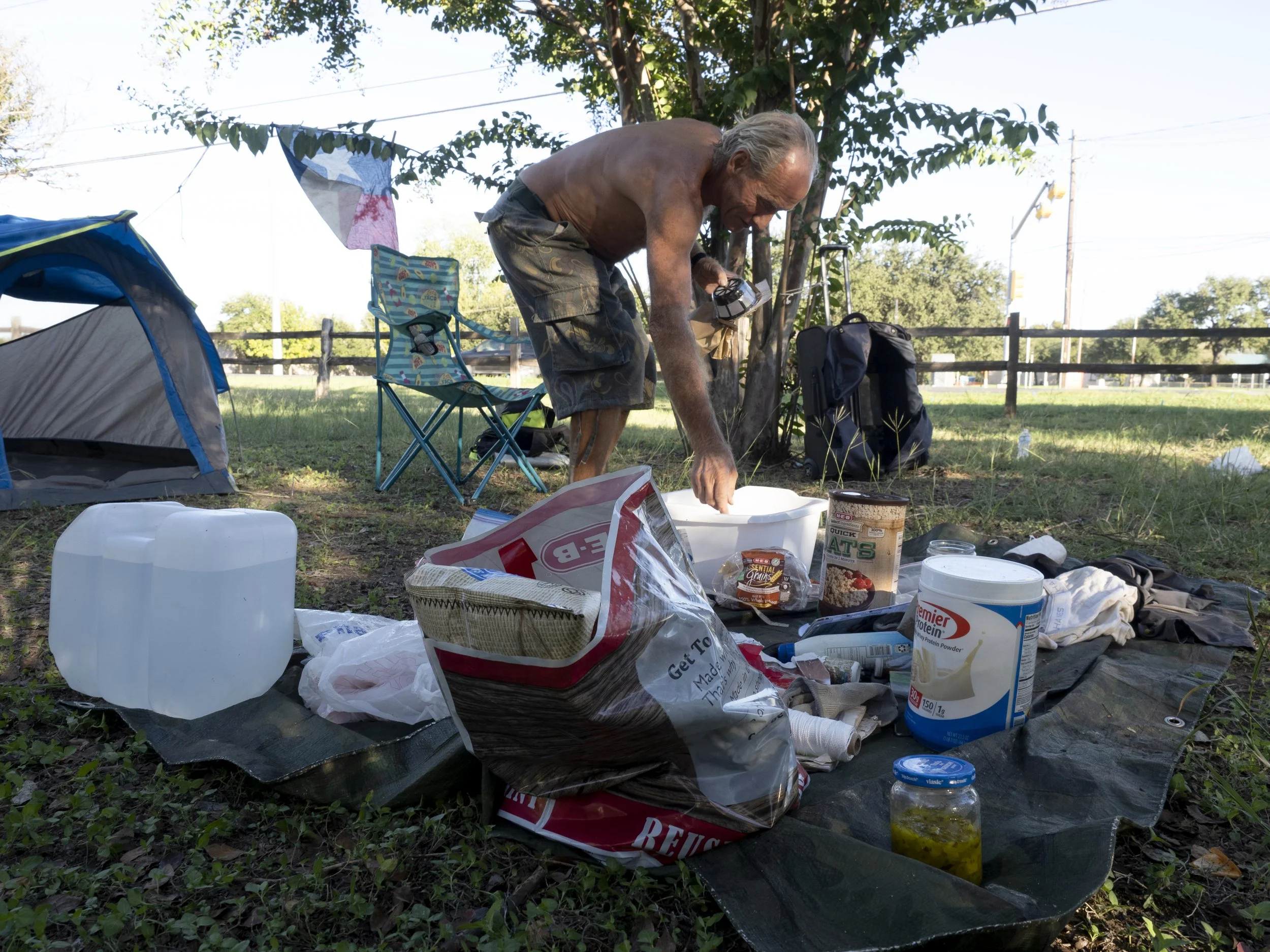 Terry Bland organizes his food and supplies at his camp in Roy G. Guerrero Colorado River Metro Park, Saturday, Oct. 16, 2021, in Austin, Texas.