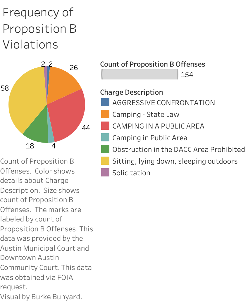 Proposition B, approved by voters on May 1, 2021, makes it a Class C misdemeanor to camp in public areas not designated for camping, solicit anything of value at specific hours and locations and to sit or lie down on public spaces in downtown Austin or around the University of Texas campus. Violation of this city ordinance may result in a fine of no more than $500. Although, violators of these ordinances will not face jail time if they are unable to pay their fine; and alternative options, such as, community service and conditional dismissal programs, may be utilized at the discretion of Austin Municipal Court judges.